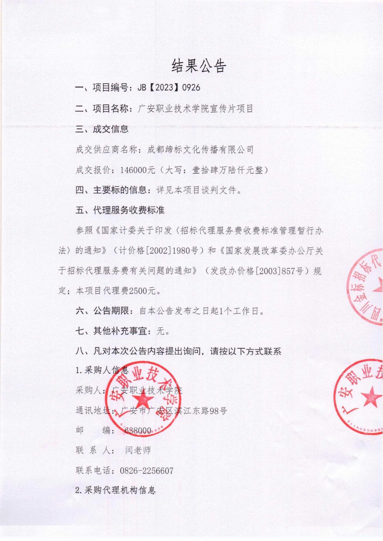 广安职业技术学院宣传片项目成交公告
